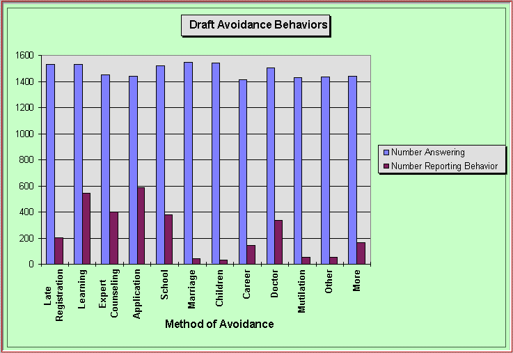 This chart shows some strategies for avoidance of the Draft. Notice that "Mutilation" was significant enough to be a category, so Michael Willetts was far from alone in the path he took. Source for numerical data: "Getting Out", pamphlet by League for Conscientious Avoidance.)
